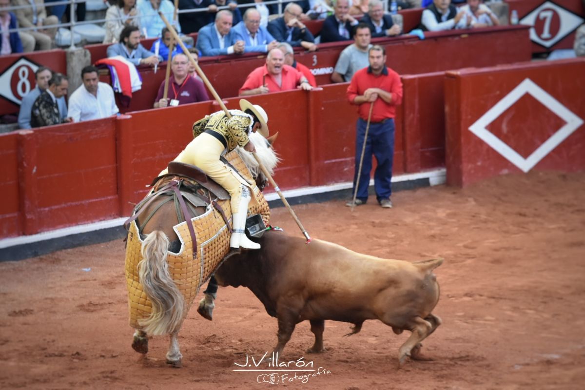 Lo pone al caballo con un galleo por chicuelinas, dejándolo lejos y al que el toro responde con bravura, metiendo la cara y empujando, puyazo sin duda emocionante y de verdad, que Alberto Sandoval ejecuta de manera impecable recibiendo una fuerte ovación por parte del público.
