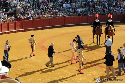 ¡Qué horrible da en la imagen cuando los toreros van en su andar sereno para pedir la venia al Presidente y entre medias corretean fotógrafos!.