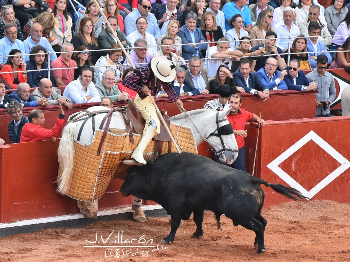 En el tercio de varas fue derribado el caballo, y mientras los monosabios se empleaban en fallidos intentos por levantar al caballo del suelo, un toro reservón y con poco que decir, llegó hasta el otro picador recibiendo de este hasta tres puyazos.