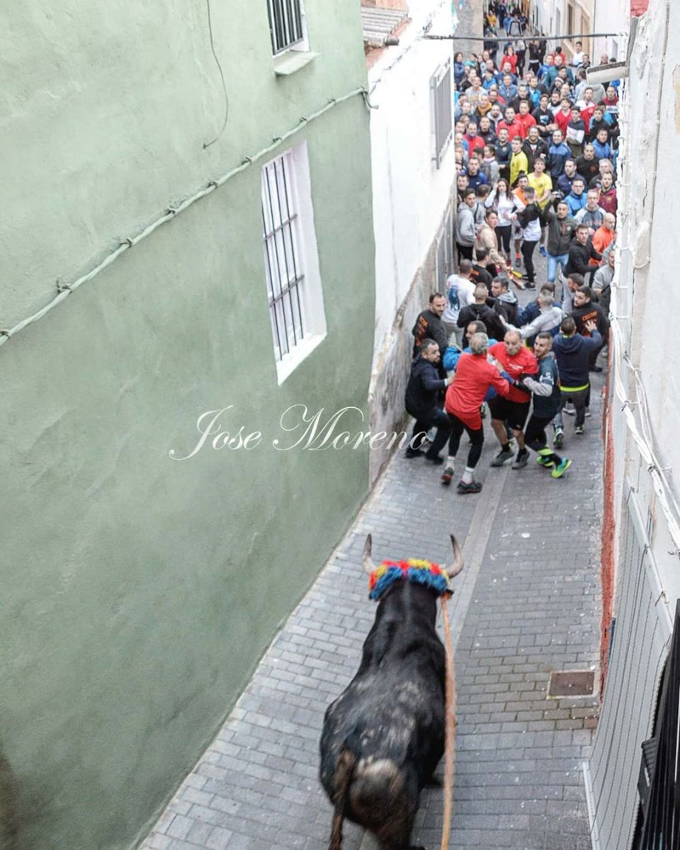 Viajero y Clavelino (recordad estos dos nombres), reses de la ganaderia Hermanos Cali de Moixent (Valencia), 4 de la tarde, la calle Mayor abarrotada, primer turno para Viajero, número 39 de dicha ganaderia, haciendo una salida espectacular del camión, un toro buscon, con peligro, desmostrando su agresividad en cada parada, hizo el recorrido de la parte alta del pueblo, donde las calles anchas para muchos corredores se hicieron estrechas, completando su hora igual de fresco que en su salida. Segundo turno, Clavelino, número 35, toro ya conocido entre los corredores, un animal muy veloz, que en su salida desde el paseo de la Alberca, en 8 pasos ya se comio la cuerda y a los corredores. Clavelino completó una tarde repleta de adrenalina, dejando tambien algún que otro susto, y casi siempre ganando sus carrreras.