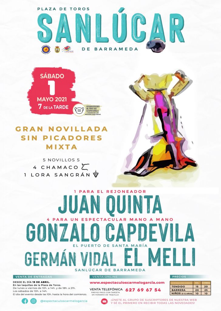 Se lidiarán 1 novillo de la ganadería de LORA SANGRÁN para el joven rejoneador sevillano JUAN QUINTA y 4 novillos de la ganadería de CHAMACO para los novilleros GERMÁN VIDAL «EL MELLI», de Sanlúcar de Barrameda y GONZALO CAPDEVILA, de El Puerto de Santa María.