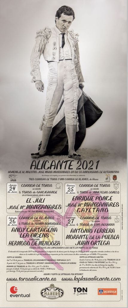 Una celebración que tendrá también al toro como protagonista con la Feria Taurina del 50 aniversario, que coincidirá con las fechas de la fiestas de Hogueras, con cuatro corridas de toros tres a pie y una a caballo teniendo a su hijo José Maria Manzanares como cabeza de cartel en dos de ellas, una con un mano a mano con Julián López ‘El Juli’ el día 24 de junio al que Manzanares padre dio la alternativa en Nimes en 1988, y otra al día siguiente compartiendo cartel con dos diestros que tuvieron gran relación con el maestro, Enrique Ponce y Cayetano. Completan la feria la corrida del 26 con Andy Cartagena, Leo Vicens y Guillermo Hermoso de Mendoza y la del 27 con Antonio Ferrera, Morante de la Puebla y Juan Ortega.