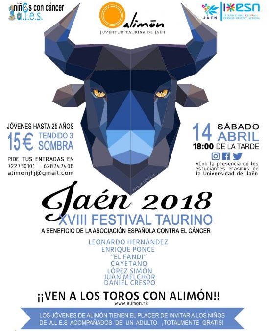 También como ya ocurriera el año pasado, ALIMÓN invitará totalmente gratis, en compañía de un adulto, también gratuitamente, a los jóvenes de la asociación ALES, entidad que trabaja desinteresadamente con los niños de cáncer del hospital infantil de Jaén, con quien la juventud taurina de Jaén está favoreciendo a través de su segunda campaña solidaria.
