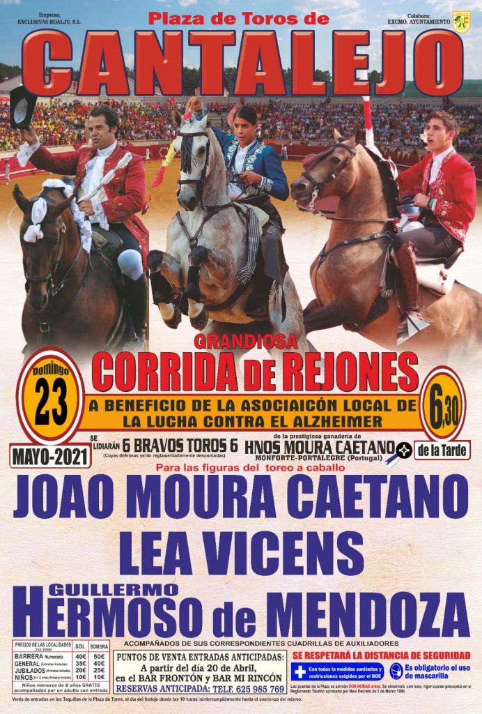La empresa taurina Exclusivas Roalju S.L., con Julián Alonso a la cabeza, cierra un interesante cartel de rejones en la localidad segoviana de Cantalejo, para el próximo día 23 de mayo a las 18:30 horas en donde ante reses de Hnos. Moura Caetano alternarán los rejoneadores Joao Moura Caetano, Lea Vicens y Guillermo Hermoso de Mendoza.