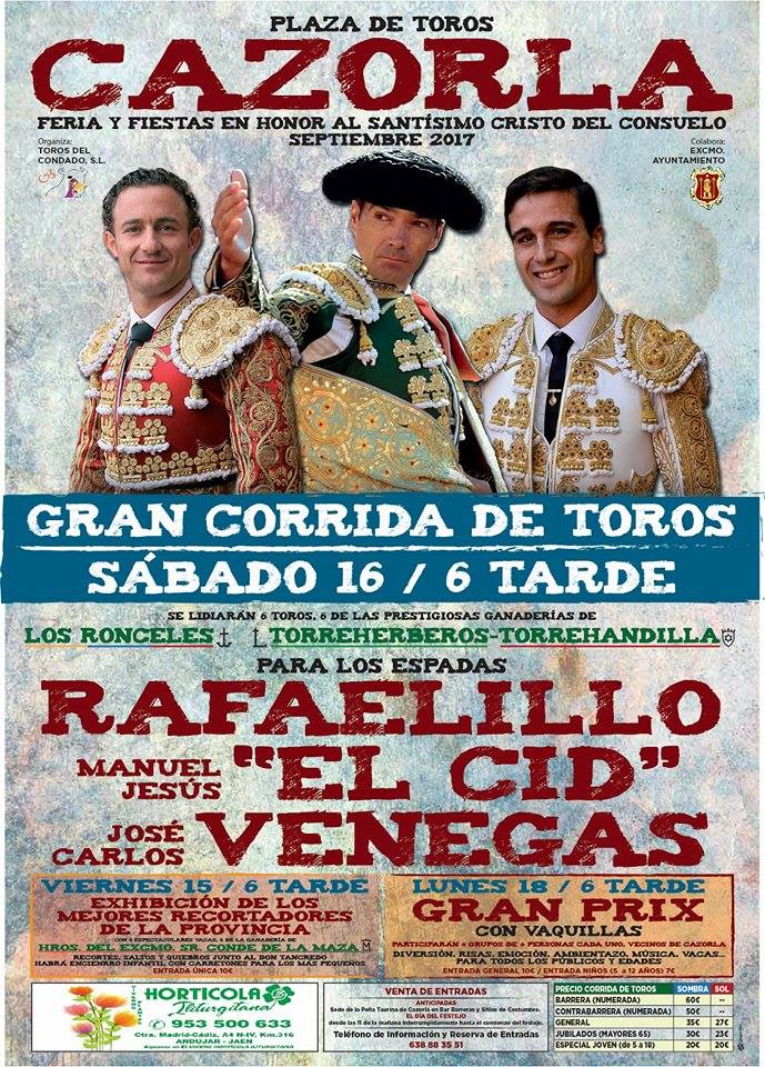 La terna formada por Rafaelillo, Manuel Jesus » El Cid», Jose Carlos Venegas, se enfrentaran a una corrida de Torreherberos y Torrehandilla.