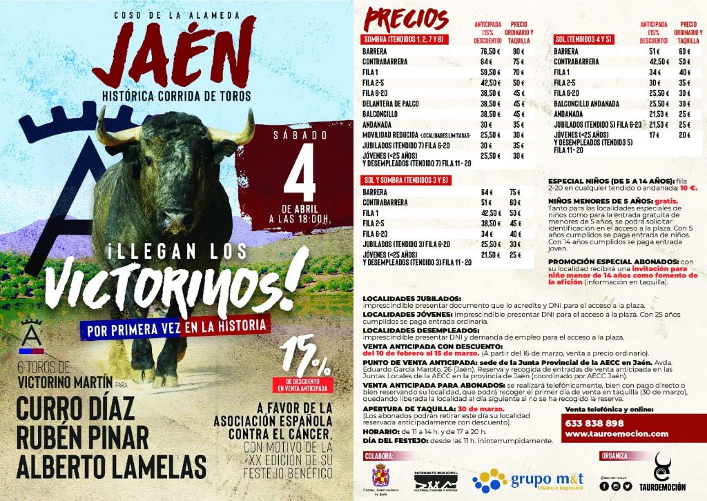 La venta anticipada para la corrida histórica de Jaén comienza mañana, 10 de febrero, con un 15% descuento. Los puntos de venta son: la sede de la AECC de Jaén (Avda. Eduardo García Maroto, 26), en el teléfono 633 838 898 y a través de la web www.tauroemocion.com. Curro Díaz, Rubén Pinar y Alberto Lamelas conforman la terna que hará el paseíllo el próximo 4 de abril en la primera corrida que lidiará Victorino Martín en Jaén. Un festejo benéfico a favor de la Asociación Española Contra el Cáncer con motivo de la XX edición de su festival.