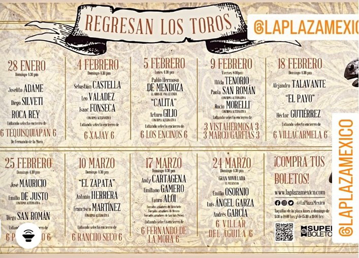 El 24 de marzo cerrarás este ansiado ciclo con una novillada. Y esos, los jóvenes aspirantes, los que sueñan con abrir tus puertas y salir en hombros, buscarán un lugar para perpetuar su nombre y pasar a ser parte de tu historia. 6 novillos de Villar del Águila saldrán por esa oscura puerta para encontrarse con Emilio Osornio, Luis Ángel Garza y Andrés García.
