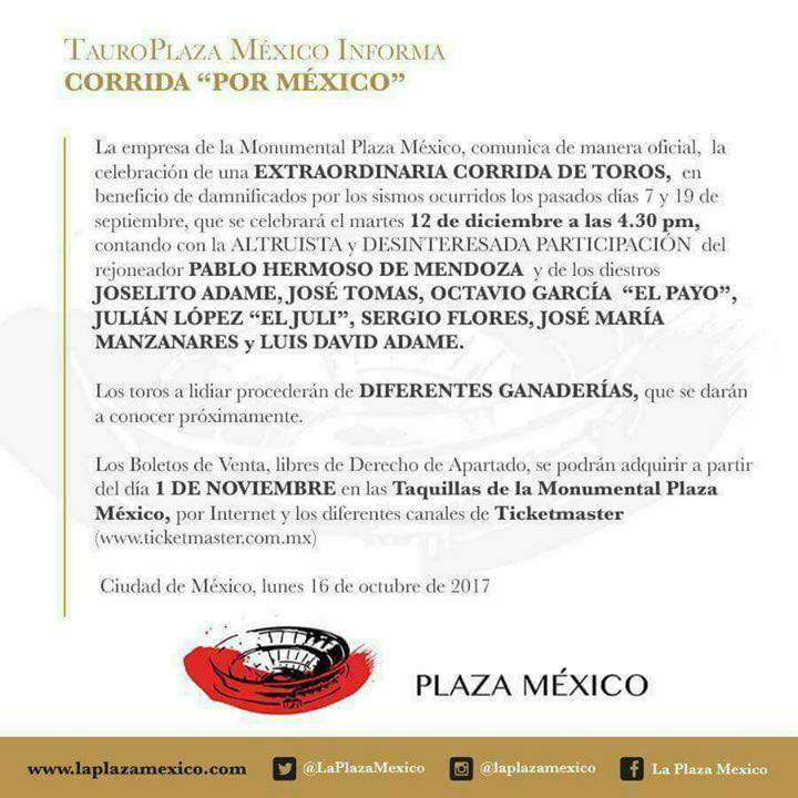 Hoy la empresa de la Monumental anuncia que 4 matadores hispanos y 4 mexicanos se van a unir junto con 8 ganaderos, para reunir fondos en pro de todas las personas damnificadas. Un gesto que habla de lo grande que es el toreo! Creo que no queda más que agradecer de pie a todos los involucrados en esta heroica y grandiosa gesta! Anexamos el comunicado de la empresa