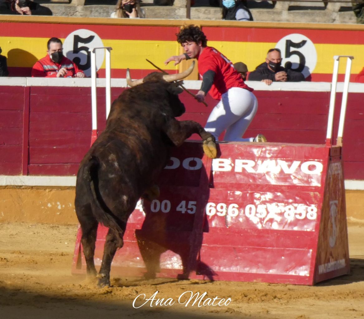 El siguiente era «Azulejo» de chorreado pelaje, con el número 75, que realizó una salida algo más fría que su hermano. Fue un toro que trabajó todos los obstáculos dominando la tijera pequeña y trabajando muy bien la grande. Acudía pronto a los cites y hacia el hilo hasta llegar a tablas, donde terminaba rematando.