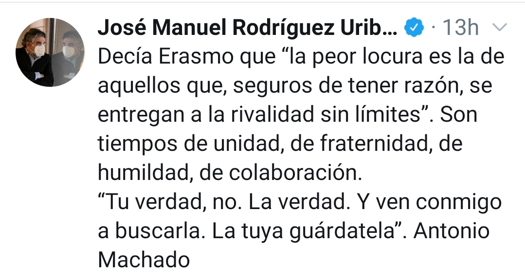 Hace unos días Rodríguez Uribe dejaba un tuit en el que abogaba la unión, la fraternidad, la humildad, la colaboración. Pues este hombre no predica con el ejemplo. Señala a la tauromaquia y la insulta públicamente. Valiente necio de nombrar a Machado y Erasmo en el mismo Tuit. Para luego divulgar unas palabras que no cumple para con los demás.