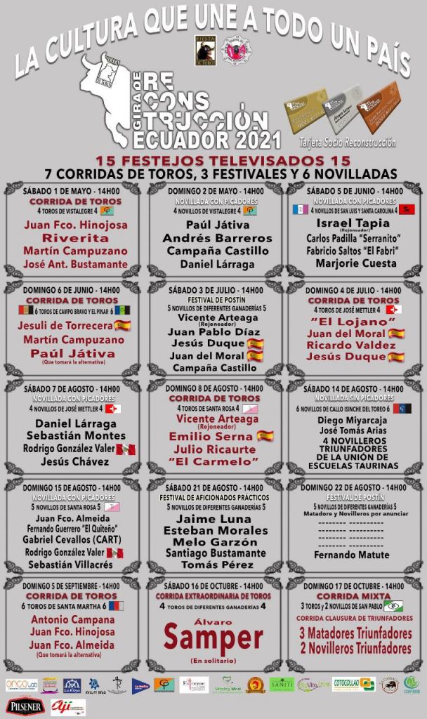 21/08/2021 (Ecuador) (14:00 horas de Ecuador) Festival de aficionados prácticos 5 novillos de diferentes ganaderías para: Jaime Luna, Esteban Morales, Melo Garzón, Santiago Bustamante y Tomás Pérez.