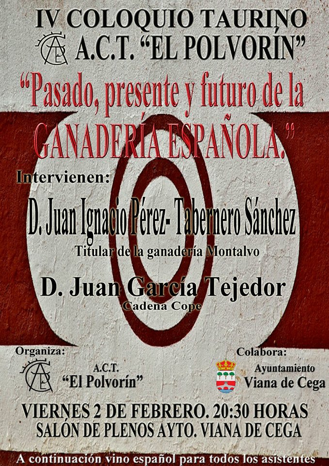 La asociacion taurina cultural «El Polvorin» celebrara el viernes 2 de febrero a las 20.30 su IV coloquio taurino, el tema a tratar es «EL PASADO, PRESENTE Y FUTURO DE LA GANADERIA ESPAÑOLA» intervienen el ganadero D. Juan Ignacio Perez – Tabernero Sanchez ( Montalvo) y Juan Garcia Tejedor (cadena Cope), interesante coloquio organizado en Viana de Cega como previa de sus toro de San Blas.