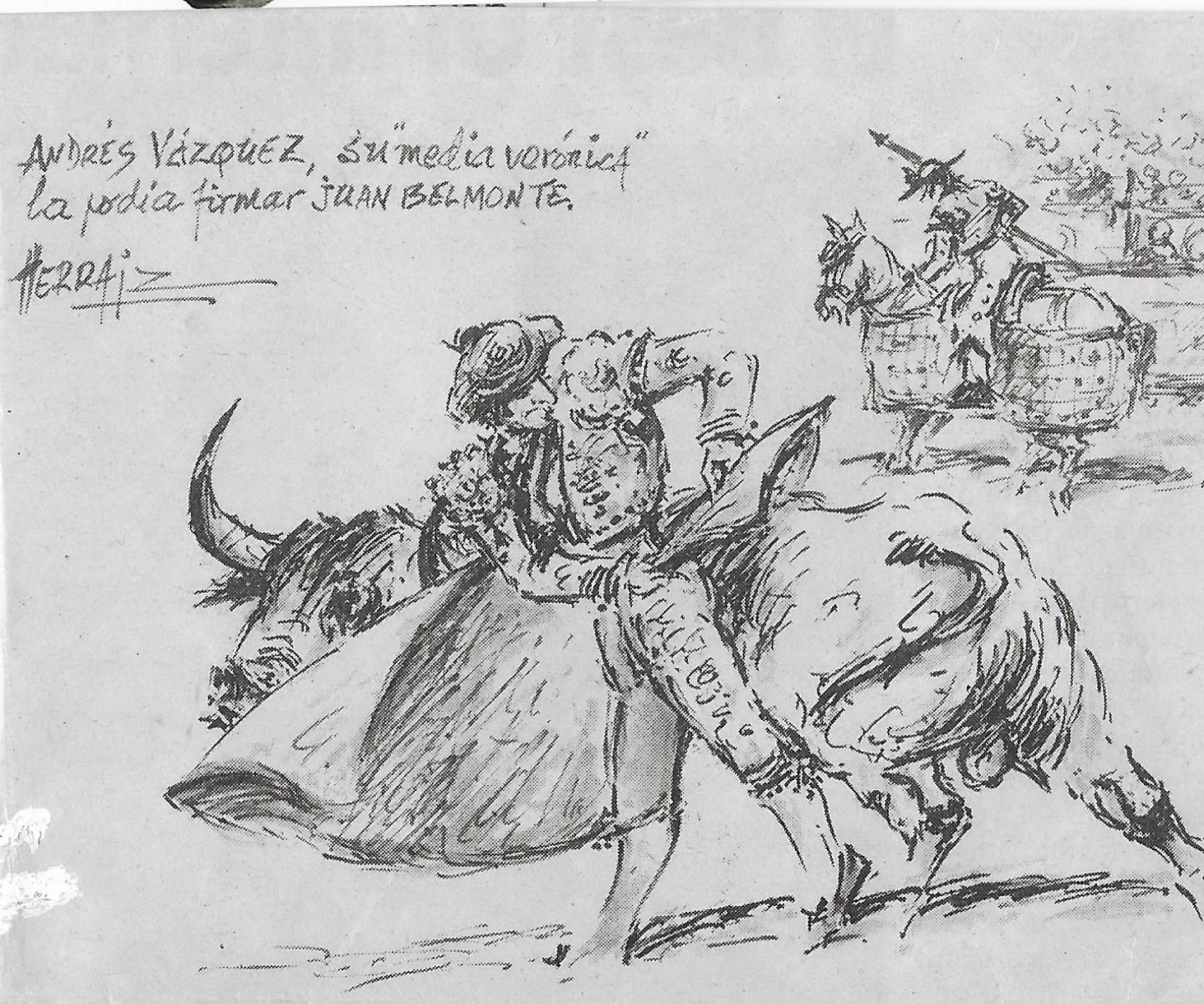 En la caricatura mostrada vemos la torería inmensa de un maestro que nos dejo hace pocas fechas, nada y más y nada menos que el MAESTRO Andrés Vázquez.
