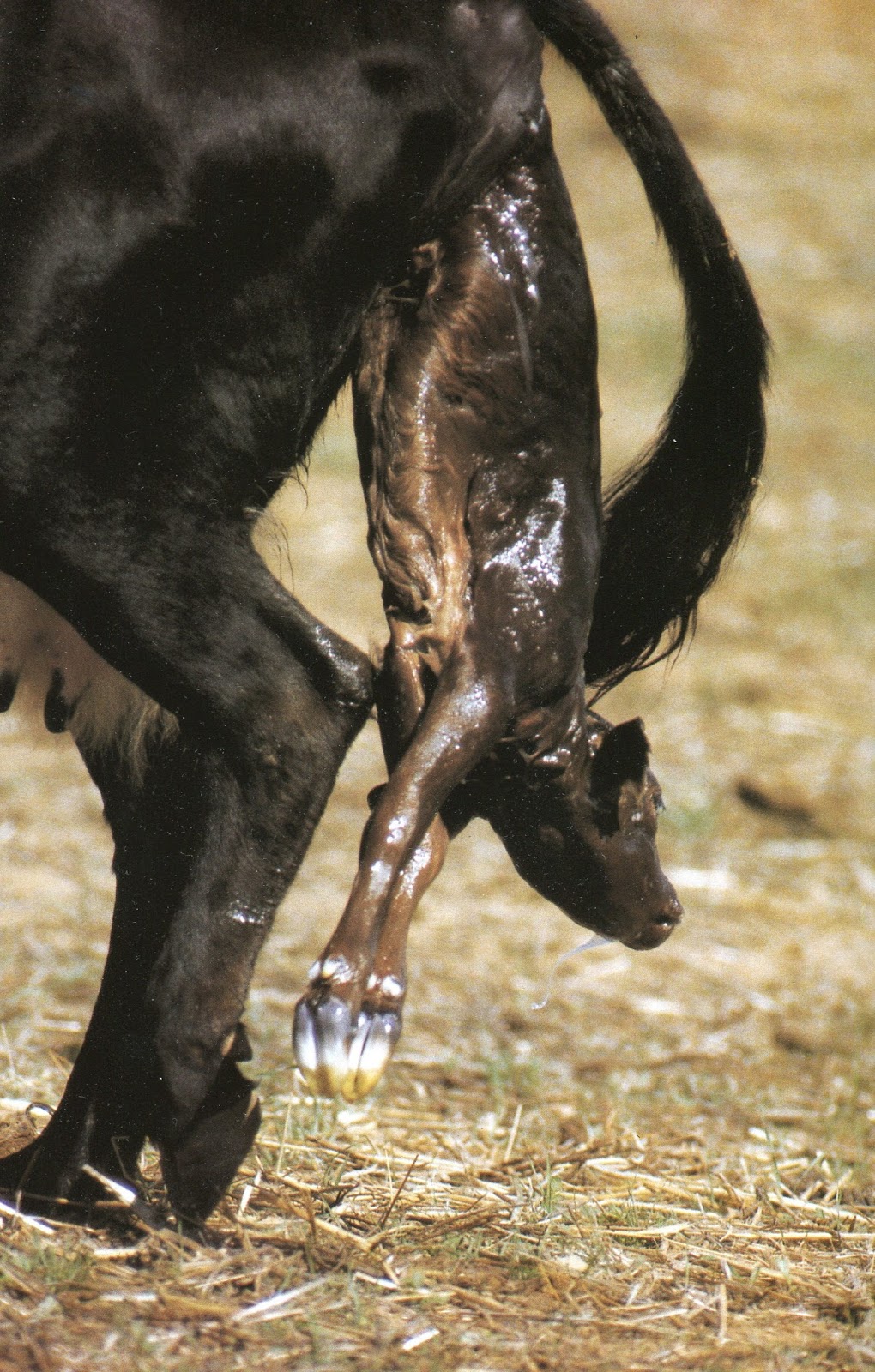 Si lo hace de pie la vaca encorva los lomos y junta las patas para ayudarse en el esfuerzo. Lo primero que se produce es la salida y ruptura de la bolsa de aguas, con la inminente aparición de la cabeza del becerro. Una vez la cabeza está fuera la vaca hace su máximo esfuerzo para empujar los hombros y el pecho del ternero a través de la abertura pélvica. Los músculos abdominales del ternero se relajan y sus caderas y patas traseras se comprimen para permitir una fácil expulsión del resto del cuerpo. El becerro nace libre de membranas fetales ya que estas permanecen fijas en el útero por los cotiledones o » botones «. Una vez que el cordón umbilical pasa a través de la pelvis y vulva, este se rompe y los pulmones del becerro comienzan a funcionar.