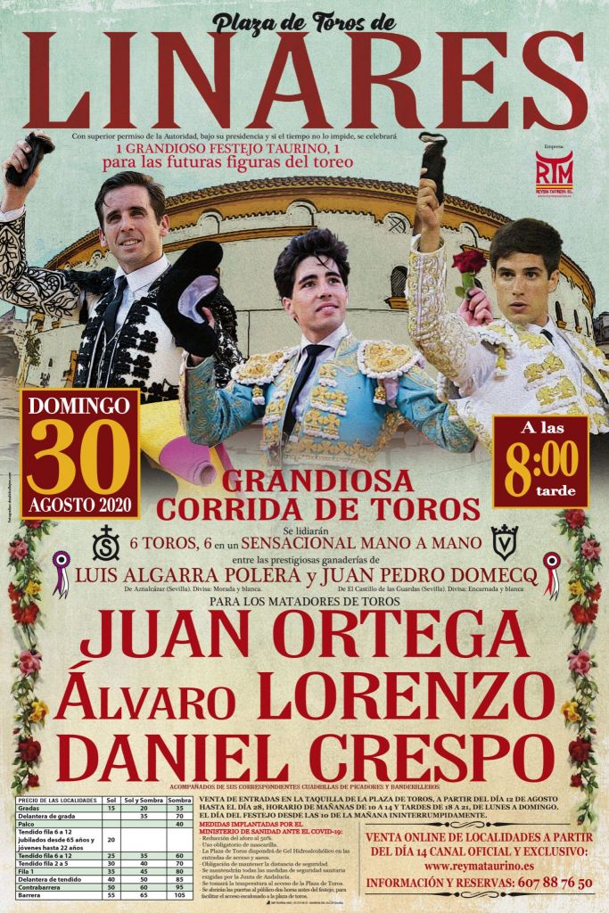 Sin dejar de trabajar en su empeño para que Linares no se quedara sin toros este año, la empresa REYMA Taurino ha organizado una grandiosa corrida de toros para el próximo día 30 de Agosto, donde actuarán los jóvenes y prometedores matadores de toros: Juan Ortega, Álvaro Lorenzo y Daniel Crespo, ante toros de las ganaderías de Luis Algarra y Juan Pedro Domecq.
