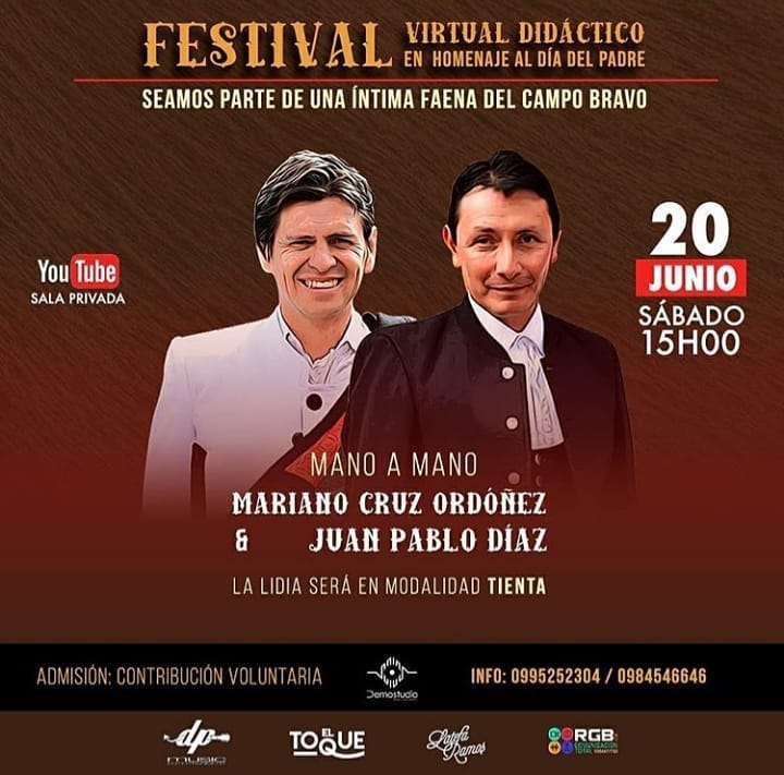 El Ecuador taurino también se vio afectado por la crisis del Covid-19 que llevó a suspender varios festejos y no anunciar otros. Los pocos festejos que se dan en este país se ven en peligro, ante esta situación los matadores riobambeños, Mariano Cruz Ordoñez y Juan Pablo Díaz, han preparado el denominado “Festival virtual didáctico en homenaje al día del padre”.