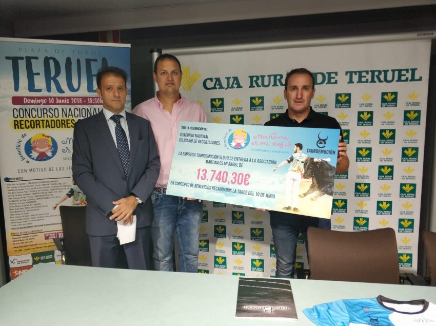 El Salón de la Bolsa de la sede central de la Caja Rural de Teruel ha acogido en la mañana de hoy el acto de entrega del cheque con los beneficios del Concurso Nacional de Recortadores Solidarios organizado por Tauroemoción en el coso turolense el pasado mes junio, a beneficio de la Asociación «Martina es mi Ángel», entidad creada por la familia de Martina Utrillas, con síndrome de Angelman, para dar visibilidad al síndrome, recaudar fondos para la investigación de este y cubrir la terapias y necesidades de Martina.