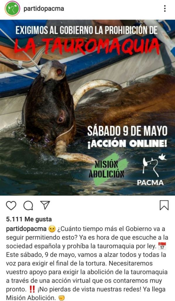 El partido animalista Pacma vuelve a cargar contra la tauromaquia y exige al gobierno su abolición. Un partido que no tiene ninguna representación en el congreso de los diputados… y que en las últimas elecciones perdieron cerca de 100mil votantes, sigue exigiendo al gobierno que acabe con la tauromaquia.