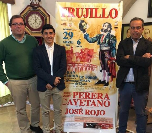 Dos figuras acompañarán al novillero local en la tradicional Feria del Queso de Trujillo. Esta mañana ha sido presentado, por el alcalde Alberto Casero, el empresario Joaquín Domínguez y el novillero José Rojo, el cartel de la corrida de toros mixta que se celebrará en la localidad cacereña de Trujillo, ilustrado por el artista extremeño José Tomás Pérez Indiano.