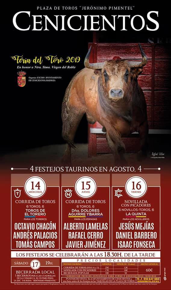 Dos corridas de toros, una novillada picada y una becerrada local conforman la “Feria del Toro” 2019 de la localidad madrileña de Cenicientos, programada entre el 14 y el 17 de agosto.