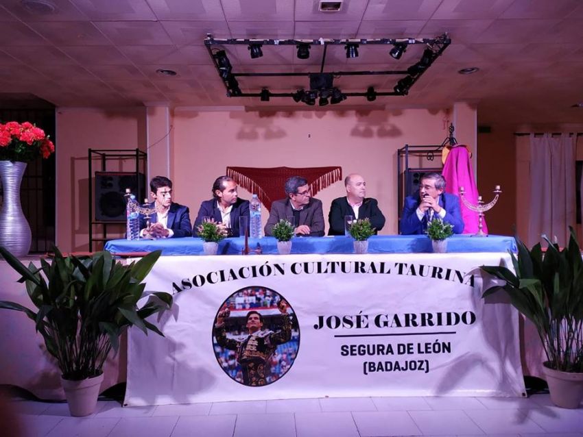 La jornada del día 7 fue protagonizada por la Escuela Taurina de Badajoz, que ha formado figuras de la talla, entre otros, de Antonio Ferreras, Alejandro Talavante, Miguel Ángel Perera, Ginés Marín, (también Andrés Roca Rey pasó unos meses por sus aulas) o el propio José Garrido que da nombre a la Asociación segureña. Este último no nos pudo acompañar por inminentes compromisos en América. Abrió el coloquio Lorenzo Molina, alcalde de Segura de León, diputado provincial de Turismo y presidente del Patronato de Tauromaquia y de la Escuela Taurina, que defendió el presupuesto de esta no como gasto, sino como inversión, Su condición de maestro ha imprimido a la escuela un fuerte contenido de formación personal de los alumnos, al lado de la formación teórica y práctica específicamente taurina.  Miguel Domínguez entrevistó a los maestros y formadores Luis Reina y Luis Reinoso “El Cartujano” y al alumno y novillero José Antonio Monesterio. Todo el proceso formativo que lleva a cabo la Escuela fue expuesto con detalle por los intervinientes. Por tercer día el aforo se completó con socios, acompañantes e invitados de las peñas taurinas de Cabeza la Vaca, Fuentes de León, Fregenal de la Sierra, etc. Un vino de honor y productos de la tierra, servidos por el Pub Marina, cerraron las tres jornadas dedicadas a charlas coloquio sobre el mundo taurino. Finalmente el día 8 tuvo lugar la convivencia de socios e invitados en la finca del ganadero de capeas Angel Manuel Jaramillo. La lidia de unas cuantas becerras y vaquillas en los cerrados de la finca divirtió a pequeños y grandes, ciento veinte reunidos, antes y después de dar cuenta de una exquisita garbanzada y otros productos de la gastronomía local.
