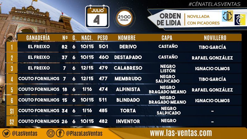 Primera novillada nocturna del mes de julio dentro del ciclo «Cénate Las Ventas». Se lidiarán tres novillos de El Freixo y tres de Couto de Fornilhos (4º, 5º y 6º) para Tibo García, Rafael González e Ignacio Olmos.