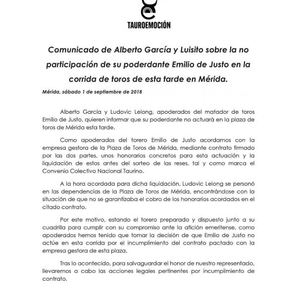 Plaza de Toros de Mérida, Badajoz. Tradicional corrida de toros. Un tercio de entrada. Toros del Monte de la Ermita, correctos de presentación y variado juego, para Fortes: ovación, ovación y silencio; y Luis David Adame: silencio tras aviso, silencio tras aviso y dos orejas. En el cartel estaba anunciado también Emilio de Justo. Sin embargo, sus apoderados, Alberto García y Luisito, comunicaron su ausencia en el mismo por medio del siguiente comunicado.