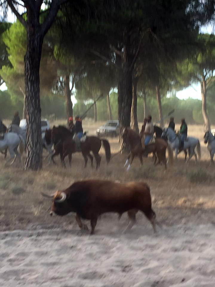 Una vez llegado a la zona de los caballista, pronto le rodearon y le acompañaron en un gran recorrido por el pinar, en el que el toro en ningún momento hizo por cornear a los caballistas, durante cerca de media hora el Toro de la vega estuvo corriendo por el prado sin apenas detenerse