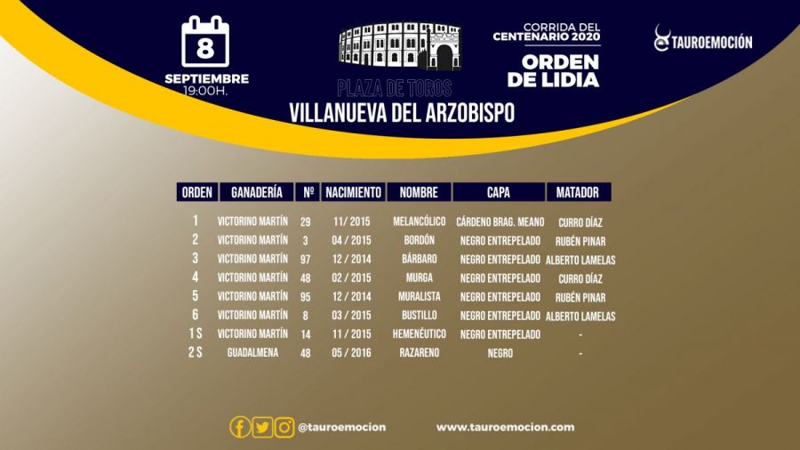Félix Majada, mayoral de la ganadería Victorino Martín, y el propio Victorino comentan, a través de un video subido a redes por parte de la empresa Tauroemoción, la corrida de toros reseñada para Villanueva del Arzobispo (Jaén). Ambos coinciden en que los seis de la «A» «son serios» y que el encierro, en cuanto a presentación, «va bastante por encima» de la categoría de la plaza.